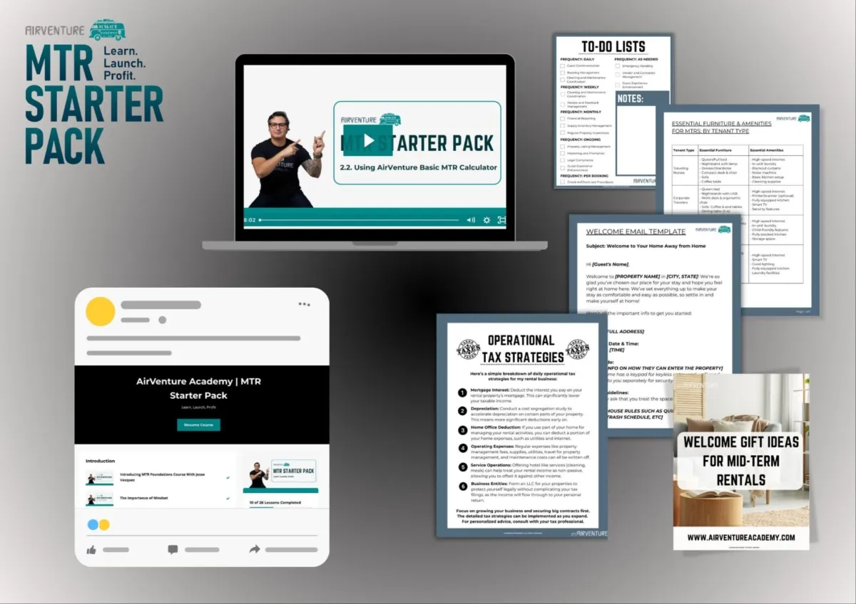 You’ll get pre-recorded video lessons, templates, checklists, calculators, and other resources to help you set up and manage your mid-term rental successfully.